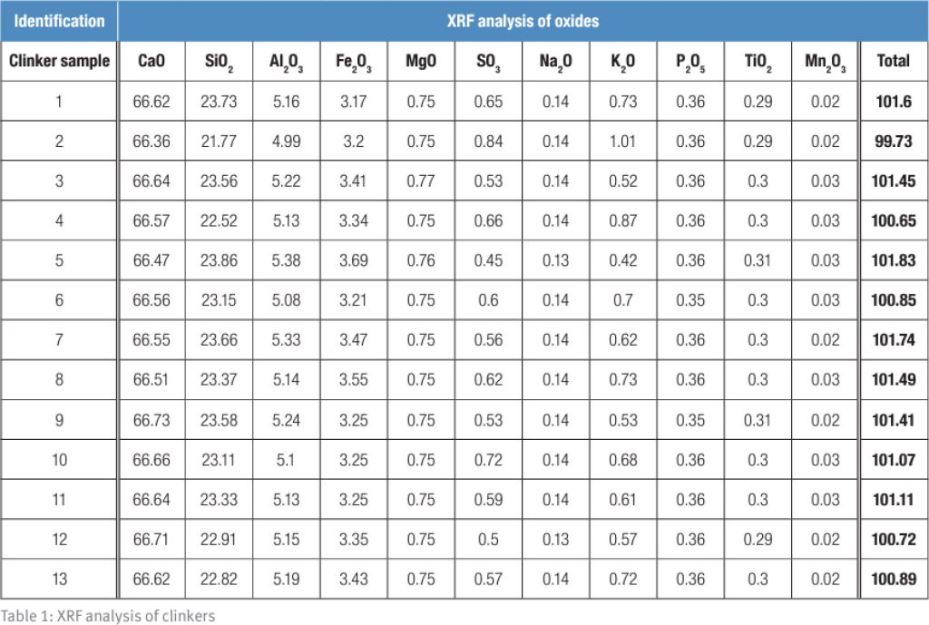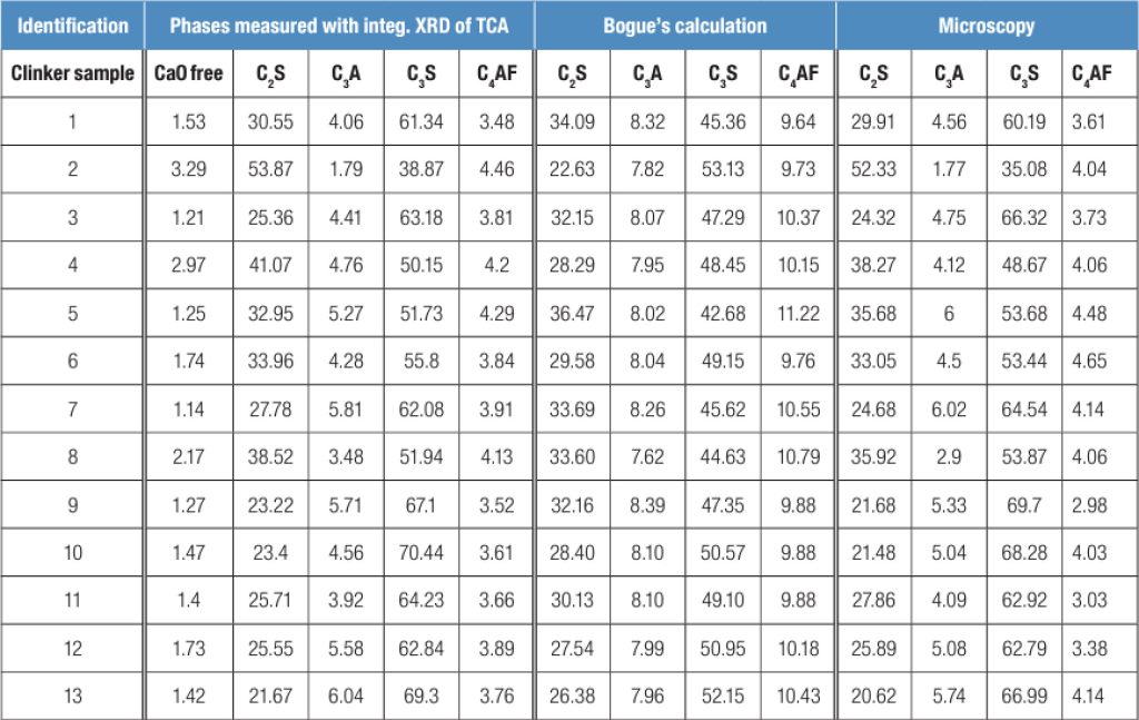 В таблице 1 приведены результаты химического анализа (общая концентрация оксидов), полученные с помощью рентгенофлуоресцентного анализа оксидов. Эти концентрации используются для расчета эквивалентных концентраций клинкерных фаз по формуле Bogue: