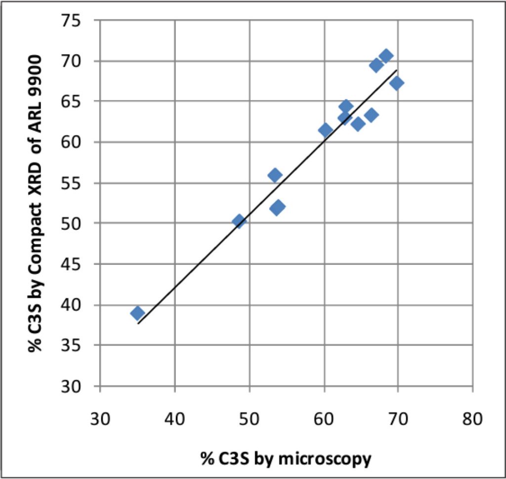Результаты, полученные по формуле Bogue, явно не соответствуют ожиданиям. Сравнение данных микроскопии и количественного рентгеновского анализа показывает, что уникальную компактную интегрированную рентгеновскую систему серии ARL 9900 можно использовать в реальных технологических условиях для анализа фаз клинкера. Поскольку фаза C3S обеспечивает устойчивость к цементу, такой рентгеноструктурный анализ может помочь предсказать 3-дневную стойкость к сжатию будущего цемента, полученного из этих клинкеров, в то время как на 7-дневную и 28-дневную стойкость могут влиять другие факторы, такие как, например, крупность и гранулометрический состав.