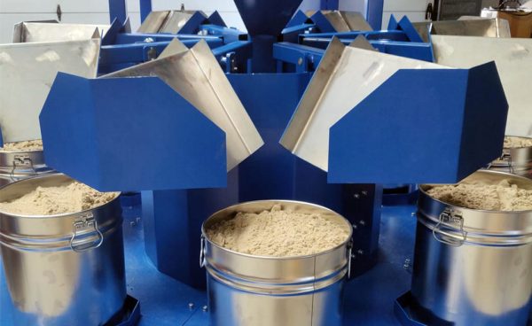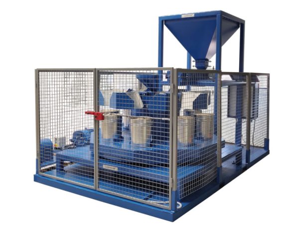 Система имеет большую воронку, куда материал загружается с помощью вилочного погрузчика. Этот материал поступает непосредственно из зоны отбора проб и упаковки в большие мешки для дальнейшей обработки.